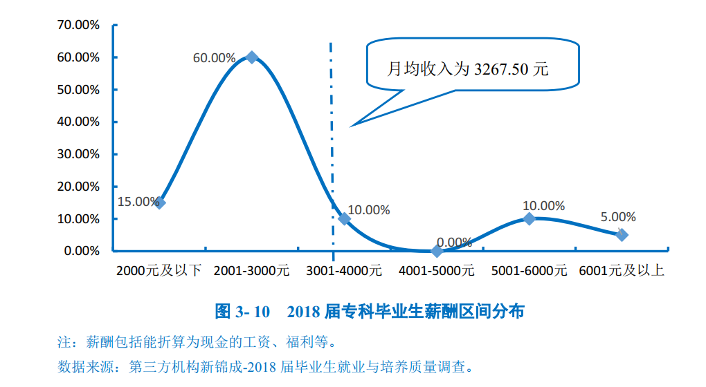 薪酬区间:学校2018届专科毕业生税前月均收入为3267.50元;月均收入区间主要集中在2001-3000元(60.00%),其次为2000元及以下(15.00%)。