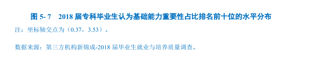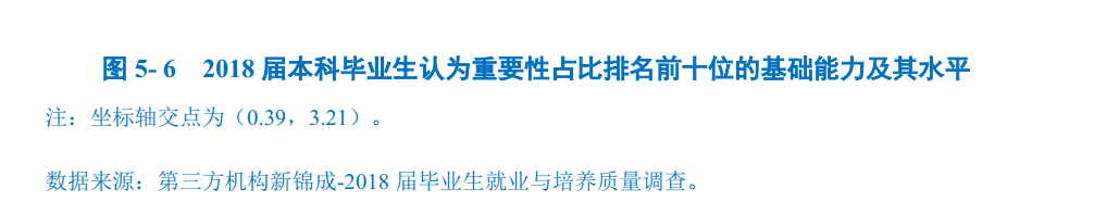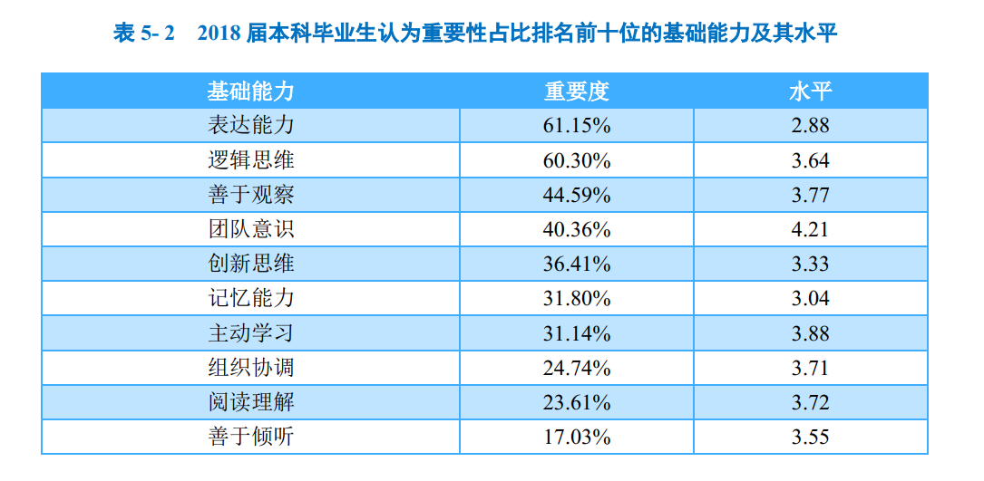 对基础能力素质的评价:对于目前工作需求而言,学校2018届本科毕业生认为重要性排名前十位的基础能力素质依次为:表达能力、逻辑思维、善于观察、团
