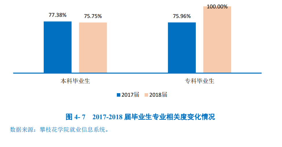 专业相关度方面,近两届本科毕业生的专业相关度均在75.00%以上;2018届专科毕业生的专业相关度达到100.00%。