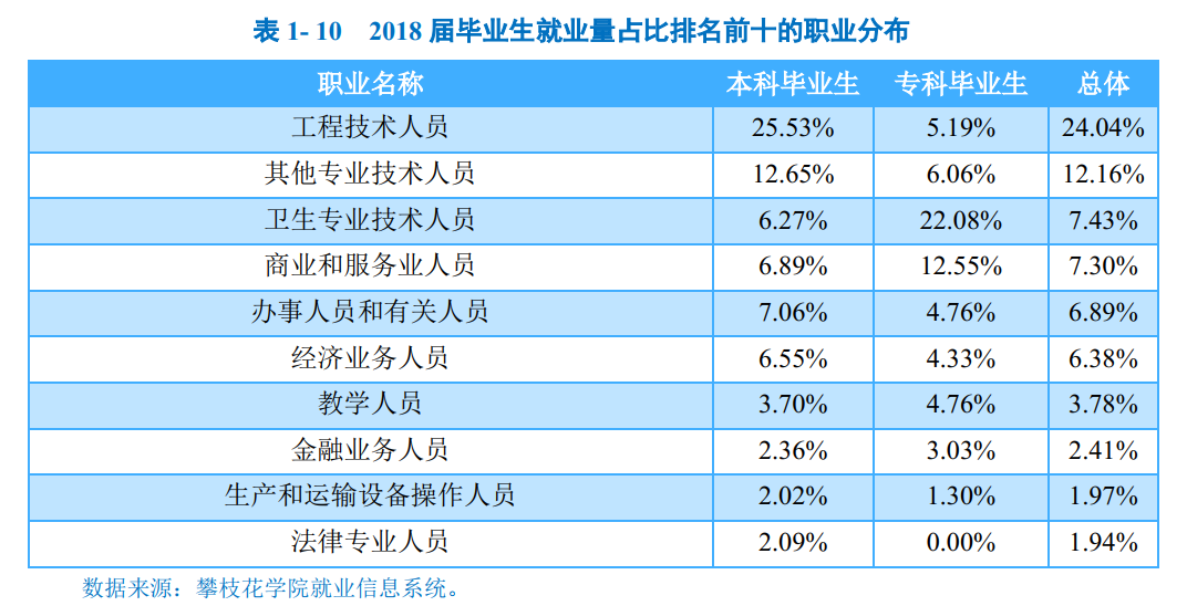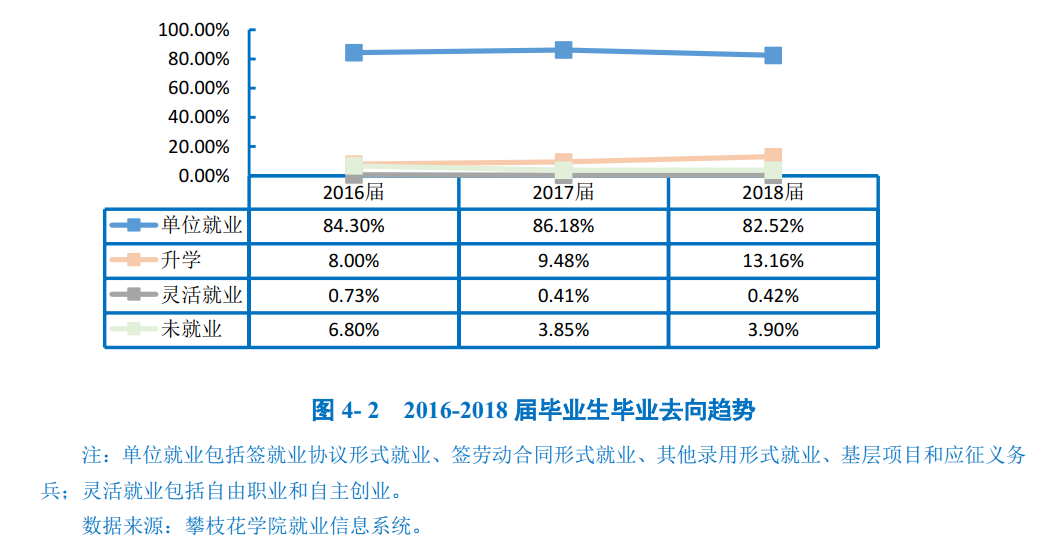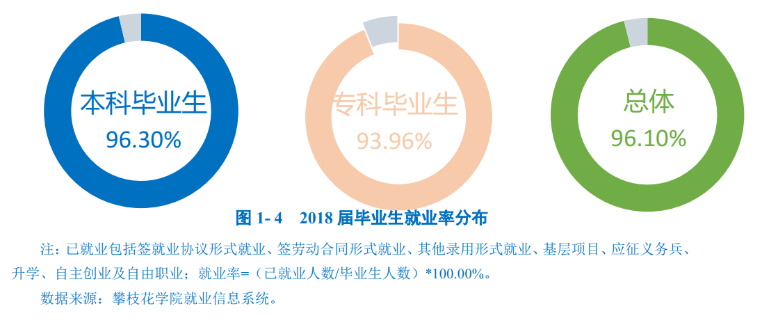 攀枝花学院2018届毕业生中超九成毕业生实现就业,就业率为96.10%。毕业去向分布详见下图。