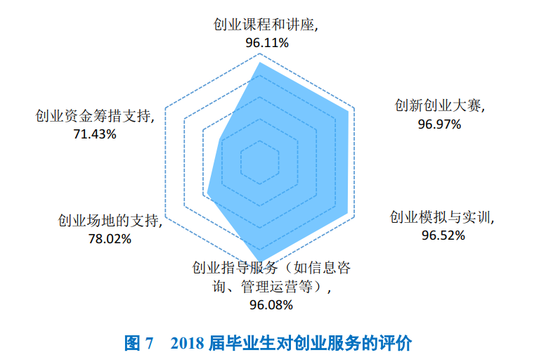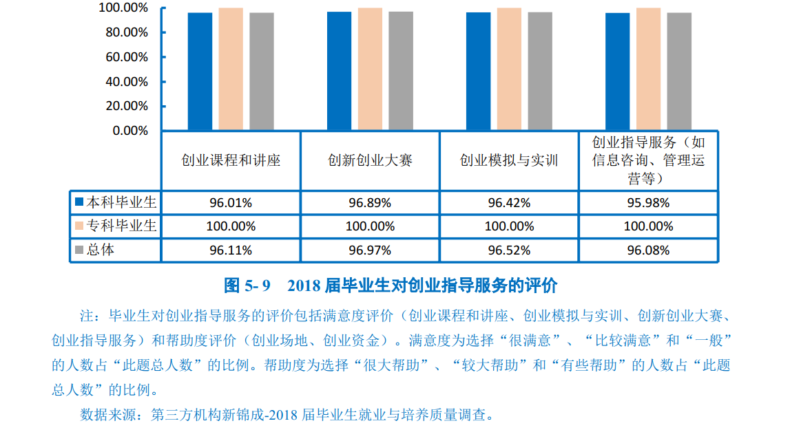 毕业生对学校创业指导服务的评价:2018届毕业生对母校各项创业教育/指导服务各方面的评价结果均在96.00%以上,其中评价结果最高的是“创新创业大赛”及“创业模拟与实训”。