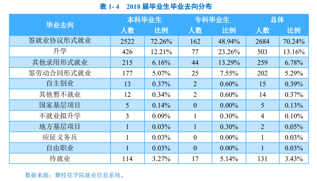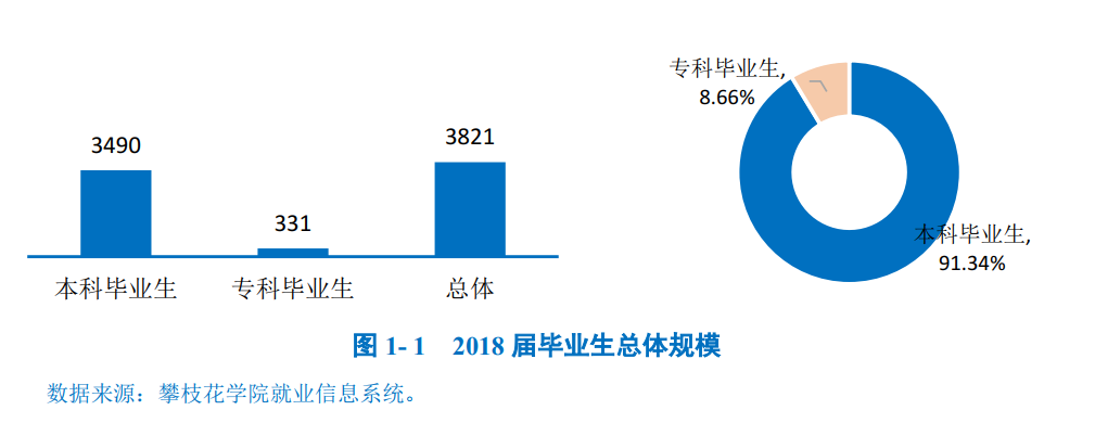 攀枝花学院2018届毕业生共3821人,其中本科毕业生3490人,占毕业生总人数的91.34%;专科毕业生331人,占毕业生总人数的8.66%。