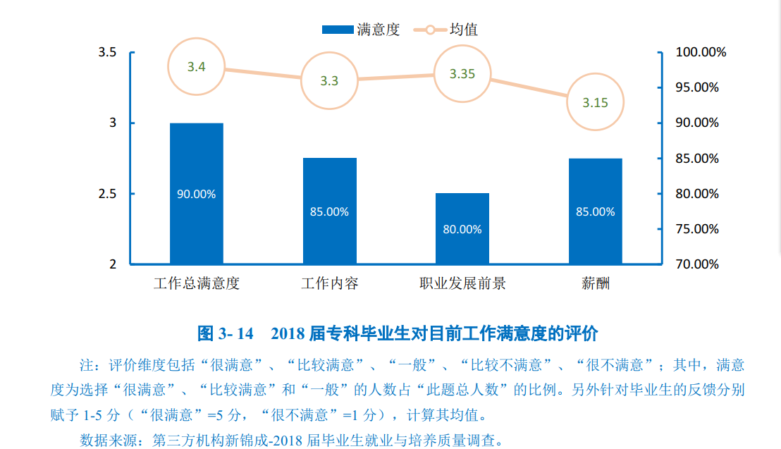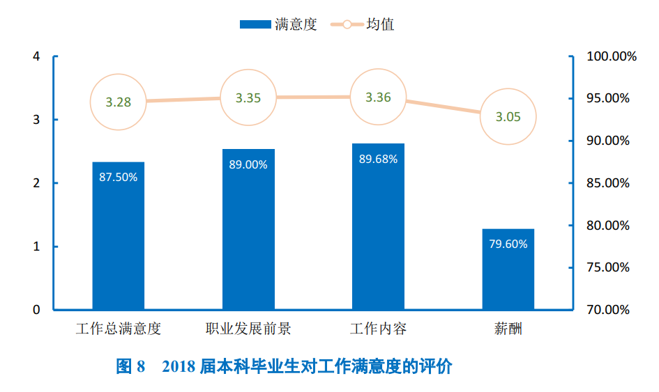 学校2018届本科毕业生对目前工作总的满意度为87.50%,处于较高水平;其中对工作内容的满意度最高,为89.68%。均值均处于3.05分及以上(5分制)。专科毕业生对目前工作总体的满意度为90.00%,处于较高水平;其次对工作内容及薪酬的满意度最高,均为85.00%。从均值来看,均处于3.15分及以上(5分制)。