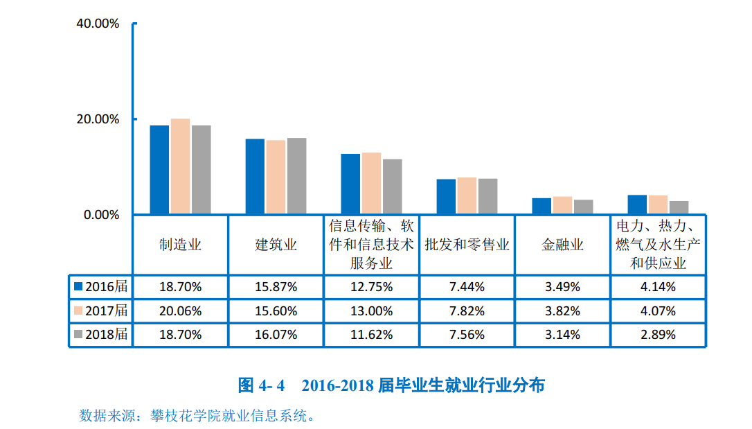 近年来,我校毕业生的就业行业分布较为广泛,覆盖了“制造业”、“建筑业”、“信息传输、软件和信息技术服务业”、“批发和零售业”等多个行业;从主要流向行业来看,毕业生在“建筑业”、“信息传输、软件和信息技术服务业”、“批发和零售业”和“金融业”的就业比例走势平稳。