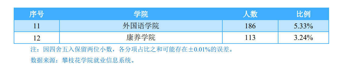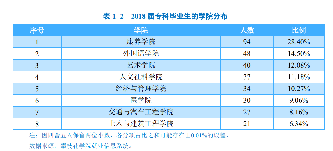 本科毕业生:学校2018届本科毕业生分布在12个学院,其中康养学院(100.00%)、数学与计算机学院(99.19%)、土木与建筑工程学院(99.00%)本科毕业生就业率位居前三。