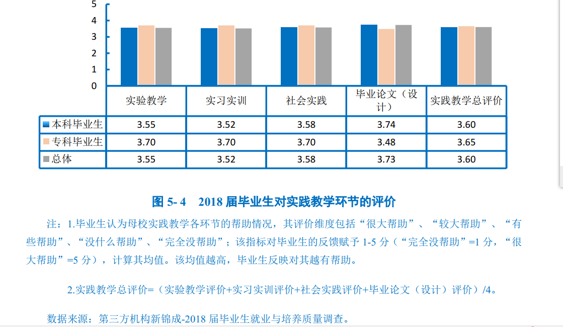 2018届专科毕业生对母校实践教学评价的综合评分为3.65分。其中,毕业生认为“社会实践”、“实验教学”、“实习实训”对其帮助度较高。