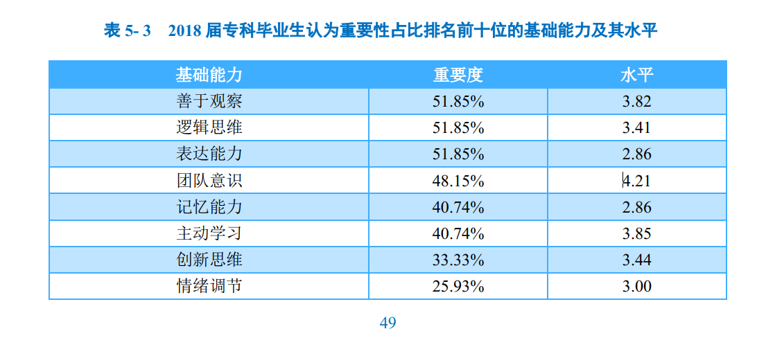 对于目前工作需求而言,学校2018届专科毕业生认为重要性排名前十位的基础能力素质依次为:善于观察、逻辑思维、表达能力、团队意识、记忆能力、主动学习、创新思维、情绪调节、严谨负责和组织协调;而自身这十项基础能力素质的水平均除“表达能力”和“记忆能力”外均在3.00分及以上;其中“团队意识”的水平相对较高,均值为4.21分。