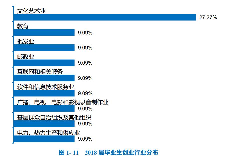 创业行业:2018届毕业生创业行业呈多元化分布,主要集中在“文化艺术业” 。