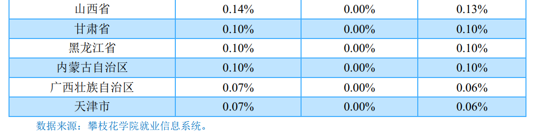省内就业城市:四川省内就业的毕业生主要流向了成都市(41.28%)和攀枝花市(28.65%);其中,本科毕业生流向成都市(42.14%)的占比相对较高;专科毕业生则主要流向了攀枝花市(40.20%)。