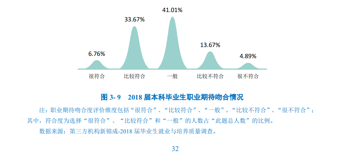 总体职业期待吻合度:2018届本科毕业生目前所从事的工作与自身职业期待的吻合度为81.44%,其中“很符合”所占比为6.76%,“比较符合”所占比例为33.67%;可见目前已落实的工作整体比较符合自身的就业期望。
