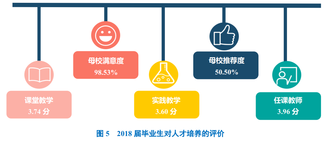 学校2018届毕业生对母校的满意度、推荐度分别为98.53%、50.50%;对课堂教学的满意度均值为3.74分,偏向“比较满意”水平;对实践教学的满意度均值为3.60分,偏向“有些帮助”水平;对任课教师的满意度均值处于3.96分,处于“比较满意”水平。