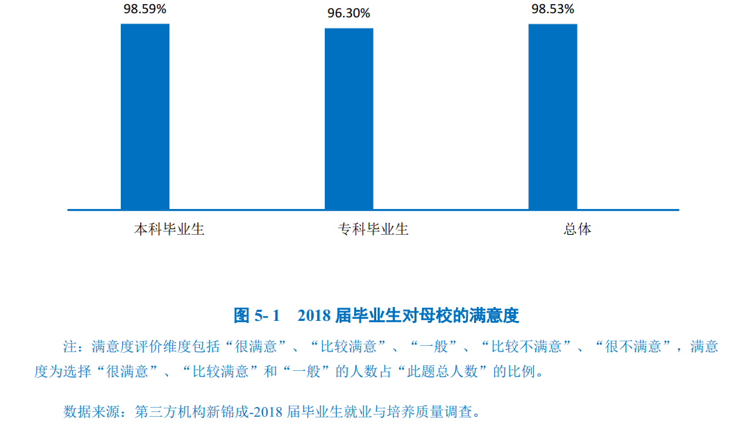 98.53%的毕业生对母校感到满意,总体满意度较高。其中,本科毕业生对母校的满意度达到98.59%,专科毕业生对母校的满意度达到96.30%。可见毕业生对母校人才培养过程及校风学风等方面均比较认同。