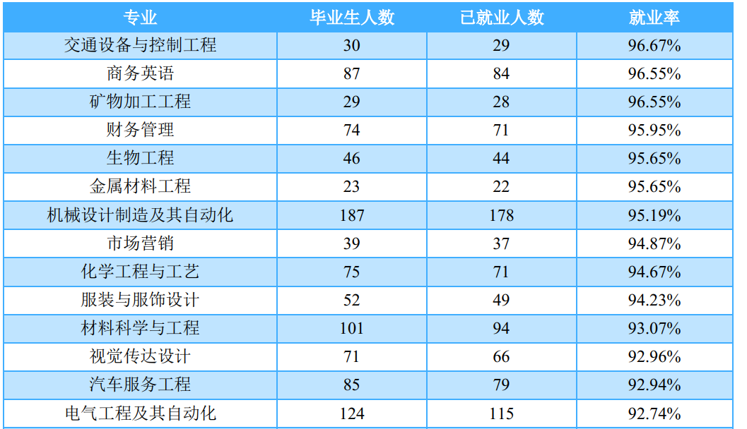 本科毕业生:学校2018届本科毕业生分布在49个专业,有46个专业的就业率均处于90.00%及以上;其中护理学、建筑学、材料成型及控制工程等12个专业就业率达到100.00%,实现了完全就业。