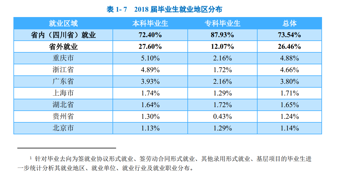 学校2018届毕业生中超七成毕业生选择在四川省内就业,服务本地经济发展;就业行业以“制造业”为主;就业职业呈多元化分布;就业单位以“其他企业”为主。