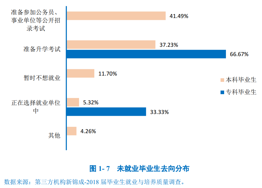 2018届未就业的毕业生共149人(其中本科毕业生129人,专科毕业生20人),对未就业毕业生进一步调研显示:本科毕业生目前主要在“准备参加公务员、事业单位等公开招录考试”(41.49%)、“准备升学考试”(37.23%)和“暂时不想就业”(11.70%);专科毕业生主要在“准备升学考试”(66.67%)和“正在选择就业单位中”(33.33%)。