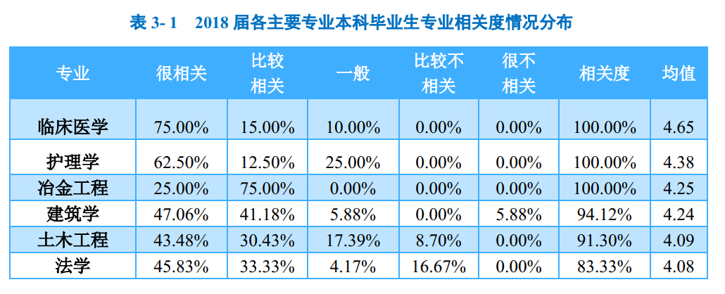 各主要专业的专业相关度:临床医学、护理学、冶金工程、建筑学的本科毕业生目前工作的专业相关度均值相对较高,均处于4.00分及以上,处于“比较相关”以上;而旅游管理、材料科学与工程、工业设计、服装与服饰设计、汽车服务工程专业的本科毕业生目前工作的专业相关度均值相对较低,均处于3.00分以下。