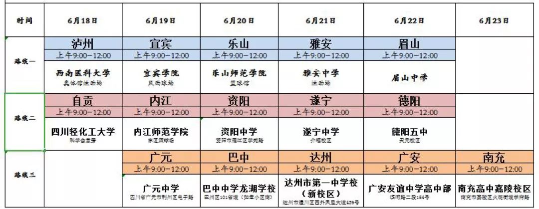 现场咨询活动于 6 月 18 日至 6 月 23 日,共计 5 天时间,分 3 条线路,同时在省内相关市州举行。具体各市州咨询会时间及地点见下图(点击查看大图):