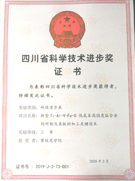 项目《新型Ti-Al-V-Fe-O 低成本高强度钛合金的研制及其板材加工关键技术》是我校作为第一完成单位,我校教师马兰、杨绍利、范兴平具体参研,与云南钛业股份有限公司合作完成。项目从理论、工艺、产品性能多维度系统地研究了降低钛合金成本和提高钛合金性能的研究路线,通过对新型Ti-Al-V-Fe-O低成本高强度钛合金的成分设计及多元合金化理论研究,获得了低成本高强度钛合金的成分设计与优化方案,确定了合金成分范围,得到了Ti-Al-V-Fe-O五元钛合金的粉末冶金-热处理工艺及真空感应熔炼工艺,对合金的杂质元素进行了有效控制,对设备进行了局部改进,并促进成果在企业成功应用。